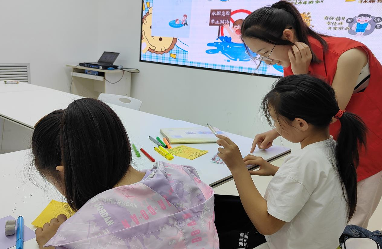 志愿者们向小朋友们讲解了在游泳过程中可能遇到的危险,提醒小朋友们日常外出要远离野外危险水域、到正规游泳场和配有救生员的场所游泳,同时教导学生们在游泳前做好热身运动,避免因抽筋而出现溺水情况。随后,志愿者们带小朋友们学习了朗朗上口的防溺水宣传歌曲及一些简单的英语词汇,请小朋友们纷纷在纸上绘出了各种各样的防溺水宣传标语,向大家展示自己学会的防溺水知识。
