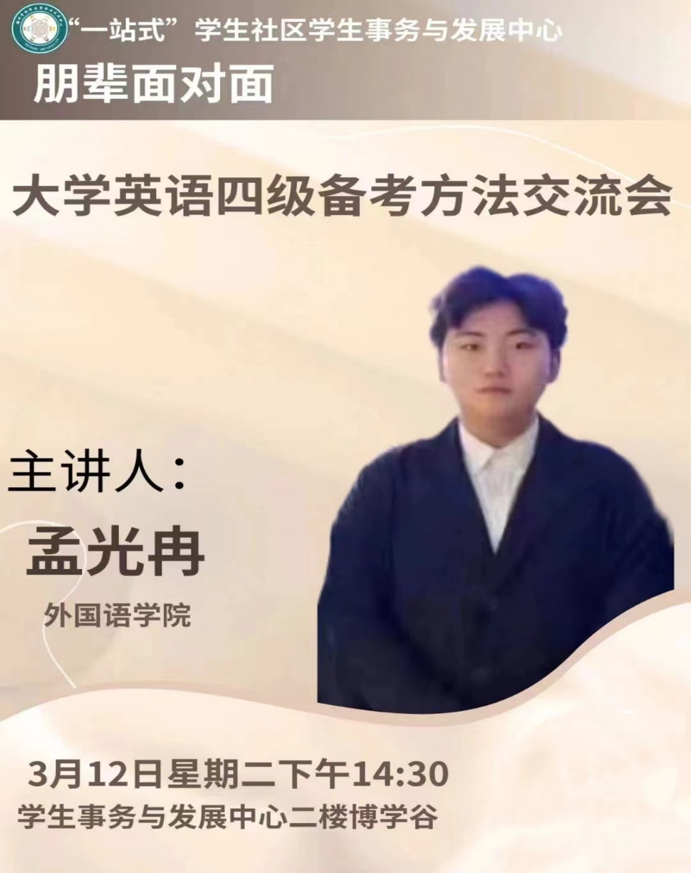 为了帮助广大学子更好地备战大学英语四级考试,我院于3月12日在大学生事物发展中心博学谷进行了大学英语四级备考方法分享交流。此次交流会旨在为同学们提供有效的备考指导,提升应试技巧。