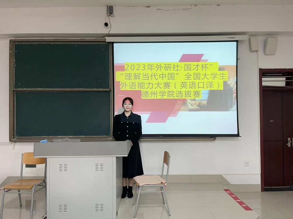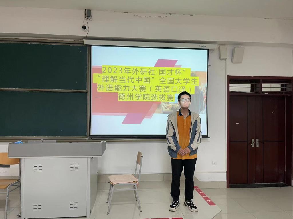 2023年9月26号下午,2023年“外研社·国才杯”“理解当代中国”全国大学生外语能力大赛德州学院选拔赛(英语口译)在博文楼227教室进行。比赛形式为现场即时口译,英译汉和汉译英各一段,主要考查习近平治国理政的时政热点词汇及其翻译。经过校内初选,bbin游戏官网的官方2020级时荣祥和杨柳两位同学将代表我校参加山东省赛区比赛。