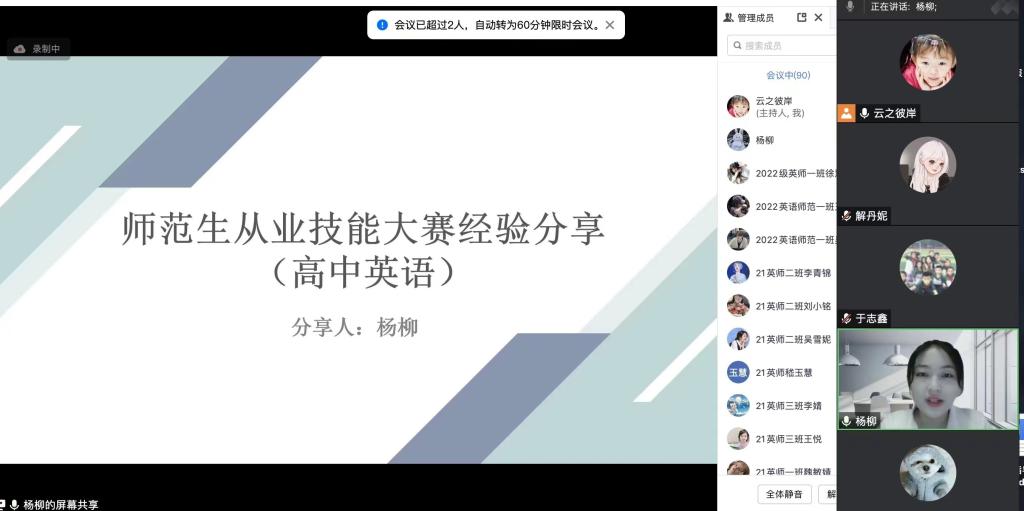 bbin游戏官网的官方教师团队、省级决赛小学组一等奖获得者解丹妮、初中组二等奖获得者杨柳同学与高中组二等奖获得者于志鑫同学及2021级与2022级英语师范专业学生参加了本次交流会。交流会上,三位获奖同学从自己的比赛经历出发,分别就对师范生从业技能大赛的认识及比赛内容、备赛过程、获奖感受、经验教训等方面进行了经验分享,与参会同学交流了多项心得,为英语专业师范生提供了宝贵的经验和建议。