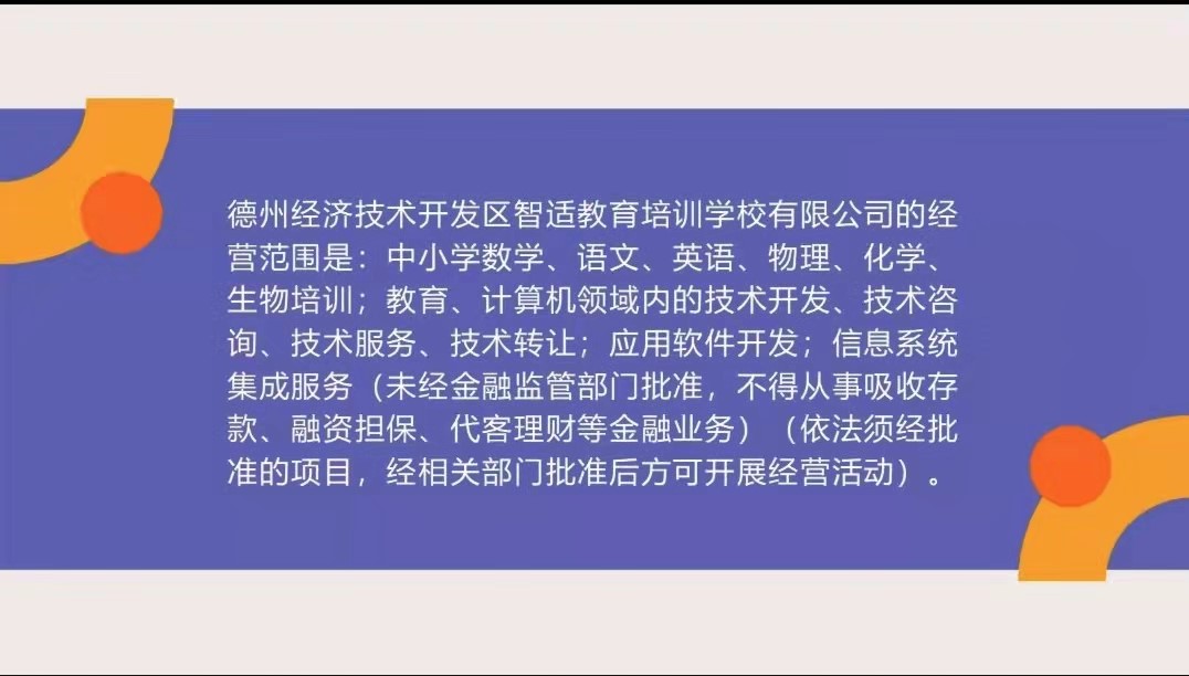 德州经济技术开发区智适教育培训学校有限公司,成立于2018-11-02,经营范围包括中小学数学、语文、英语、物理、化学、生物培训;教育、计算机领域内的技术开发、技术咨询、技术服务、技术转让;应用软件开发;信息系统集成服务(未经金融监管部门批准,不得从事吸收存款、融资担保、代客理财等金融业务)(依法须经批准的项目,经相关部门批准后方可开展经营活动)。