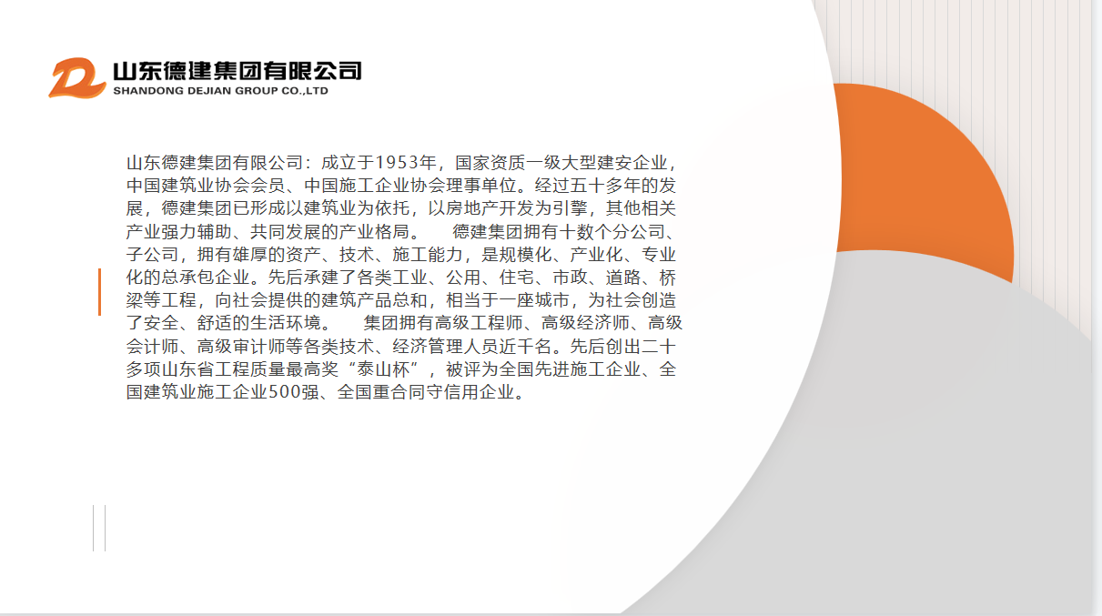 山东德建集团有限公司成立于1953年,国家资质一级大型建安企业,中国建筑业协会会员、中国施工企业协会理事单位。经过五十多年的发展,德建集团已形成以建筑业为依托,以房地产开发为引擎,其他相关产业强力辅助、共同发展的产业格局。 德建集团拥有十数个分公司、子公司,拥有雄厚的资产、技术、施工能力,是规模化、产业化、专业化的总承包企业。先后承建了各类工业、公用、住宅、市政、道路、桥梁等工程,向社会提供的建筑产品总和,相当于一座城市,为社会创造了安全、舒适的生活环境。集团拥有高级工程师、高级经济师、高级会计师、高级审计师等各类技术、经济管理人员近千名。先后创出二十多项山东省工程质量最高奖“泰山杯”,被评为全国先进施工企业、全国建筑业施工企业500强、全国重合同守信用企业。