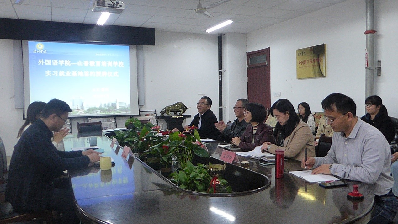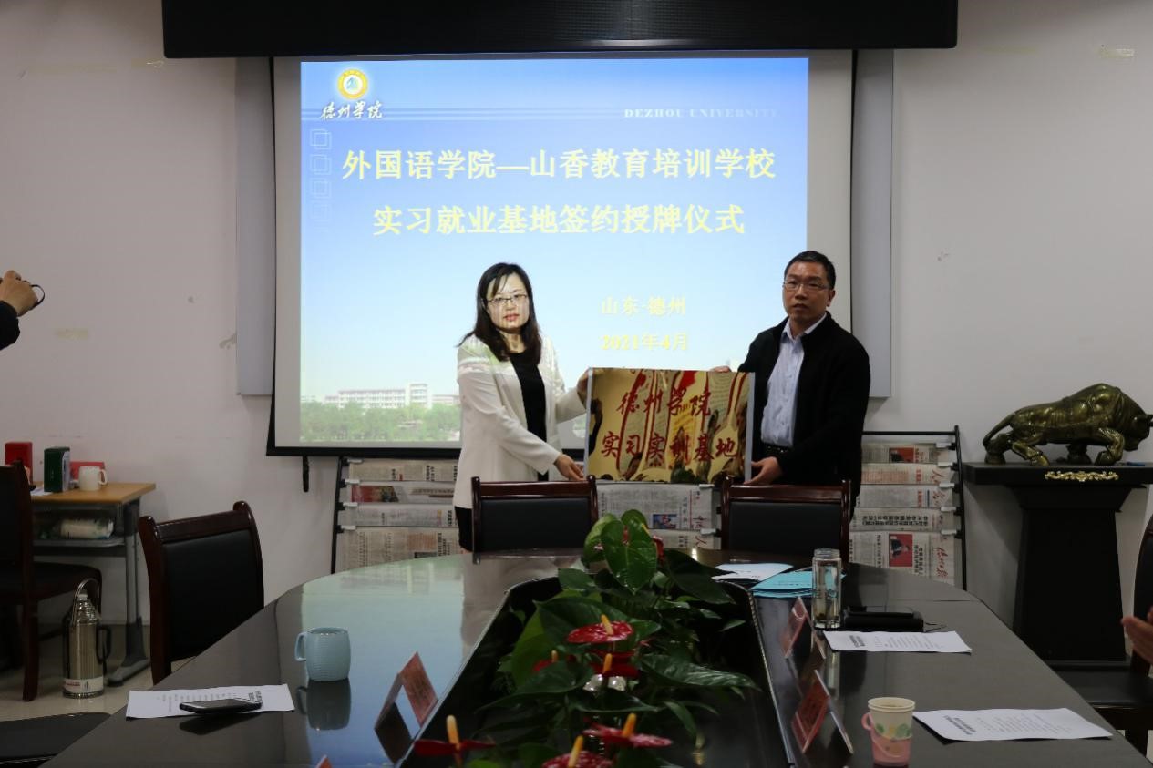 4月13日下午,我院与德州市山香教育培训学校(以下简称山香教育)实习就业基地签约、授牌仪式在博文楼206会议室举行。德州学院就业指导处处长高玉国、山香教育培训学校副校长李艳秋、李斌出席签约授牌仪式。
