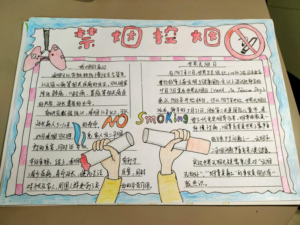 本次比赛采用手抄报的形式,在比赛中选手们的作品构图新颖,版面美观,内容丰富多彩,字迹工整,寓意深刻。选手们用精妙绝伦的绘画,简洁工整的文字展现对校园禁烟的支持,也让同学们对吸烟的危害和禁烟的必要性有了更深一步的认识,唤起控制烟草危害的责任感,营造健康的校园环境,建设无烟校园。最终,评委们通过对选手作品的版图,内容,书写等方面进行评分,最终评选出一、二、三等奖。