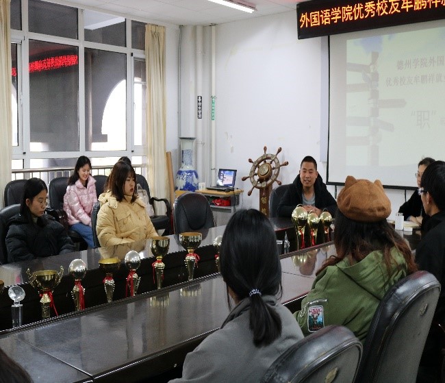 活动刚开始,牟鹏祥先生热情洋溢的将自己在德州学院的学习、恋爱经历跟同学们细细道来,随后与同学们聊起了自己的求职、工作经验。他幽默的语气让现场氛围十分活跃,仿佛生动形象的画面就展现在眼前。现场的同学们都听的十分认真入神。期间,张萌萌老师在一旁仔细倾听记录,同时对穆鹏祥先生的发言做了补充,提供了许多鲜活的案例,让活动内容更加充实生动。最后牟鹏祥学长与张萌萌老师积极与现场学生们互动,掌握在场学生的考研意向,并且给同学们提供了宝贵的经验。在同学们的热烈掌声中,活动圆满结束。