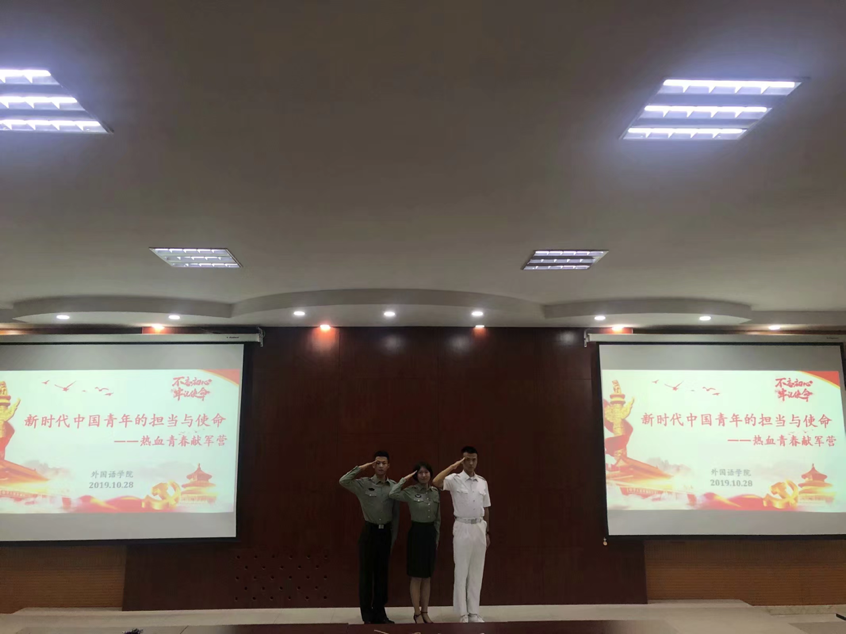 为进一步激发学生的参军报国热情,营造浓厚的征兵工作氛围,2019年10月28日,bbin游戏官网的官方在博文楼347教室举办了优秀退役大学生士兵军营事迹宣讲会,本次宣讲会由bbin游戏官网的官方2019年退役大学生钱余宽、于兆雷、华紫荆主讲,bbin游戏官网的官方辅导员张建英老师、朱馨馨老师,及全部入党积极分子、2019级全体学生参加了此次会议。