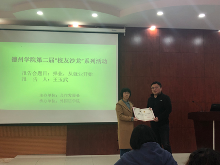 4月2日下午,应bbin游戏官网的官方邀请,外院2006届优秀校友、德州华鲁德五金制品有限公司副总经理王玉武在博文楼347教室为168名bbin游戏官网的官方学生作主题为“择业—从就业开始”的就业指导报告,党总支副书记李想为其颁发bbin游戏官网的官方“校外就业导师”聘书。