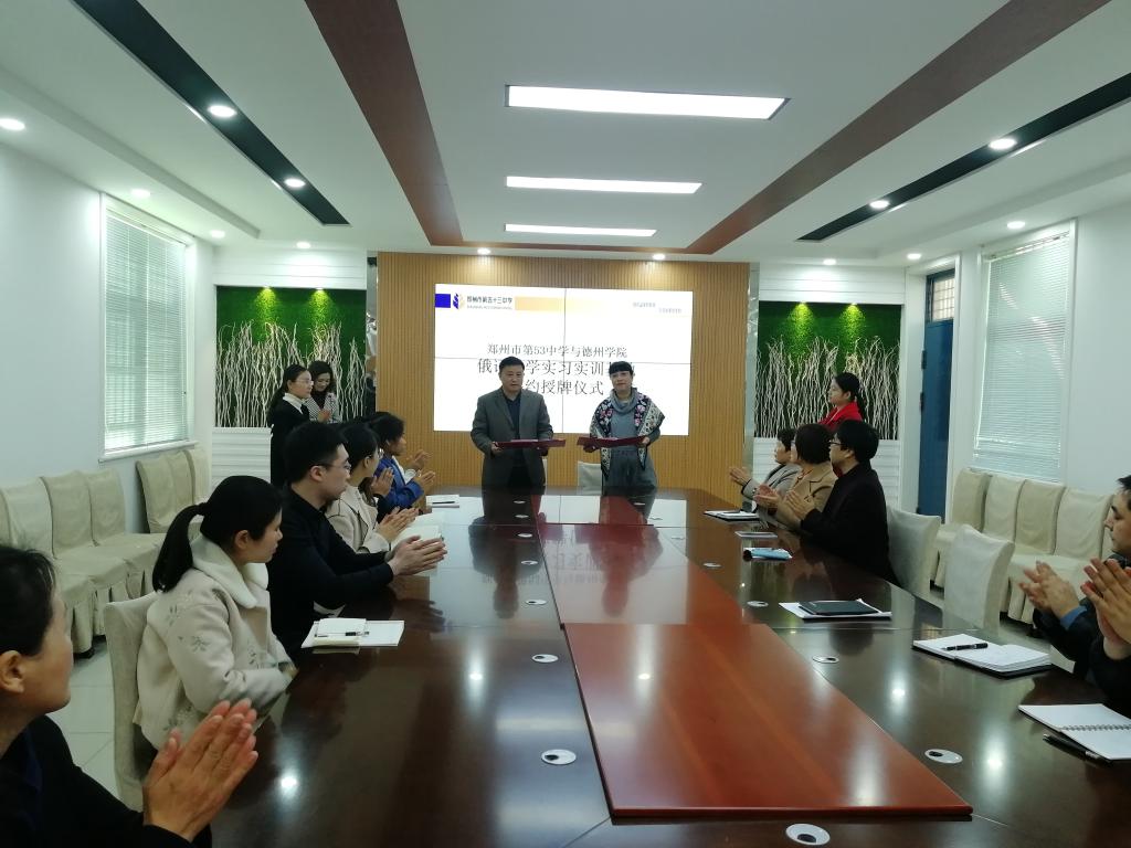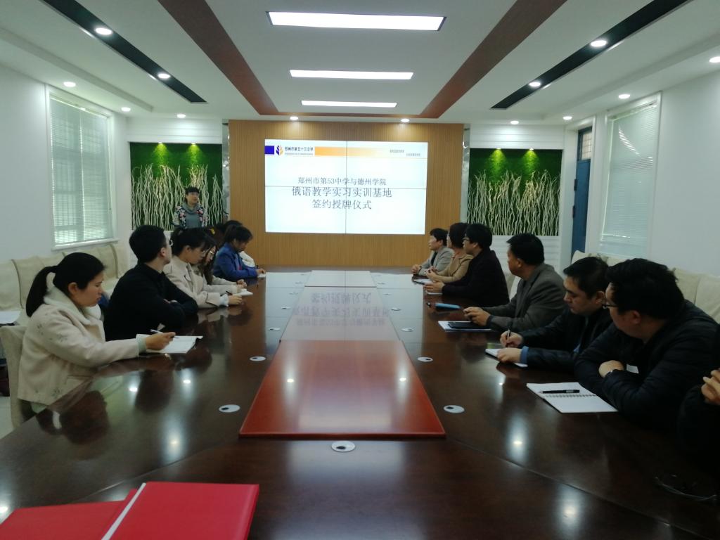 郑州市第53中学是河南省高中俄语联盟主办单位。有6个俄语教学班,1个赴俄留学培训基地,1个俄语卫星教学点。其俄语教学方式新颖,教师经验丰富。学校对我校此次实习活动十分重视,为每名实习生指派的一名指导教师,并于12日上午举行了德州学院与郑州市53中学实习实训基地授牌仪式。