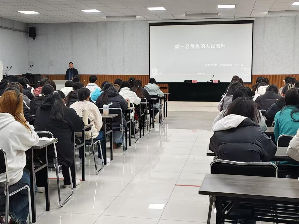 11月29日,崇德中学副校长徐长亮在博文楼528报告厅为学生举行了讲座。徐校长以多年的教学经验和丰富的案例,从职业素养和专业素养两个方面,对如何“做一名优秀的人民教师”进行了详细、生动的阐述。在职业素养方面,他指出,教师要注意着装、行为,要爱岗敬业、明确角色定位、知法懂法。在专业素养方面,他从“教”和“育”两方面进行阐述,强调教师要不断提高专业素养,备好课,上好课,积极参与教研活动。此外,教师应修身、培养自己的专长、学会接受挑战,合理运用表扬和批评助力学生健康成长。