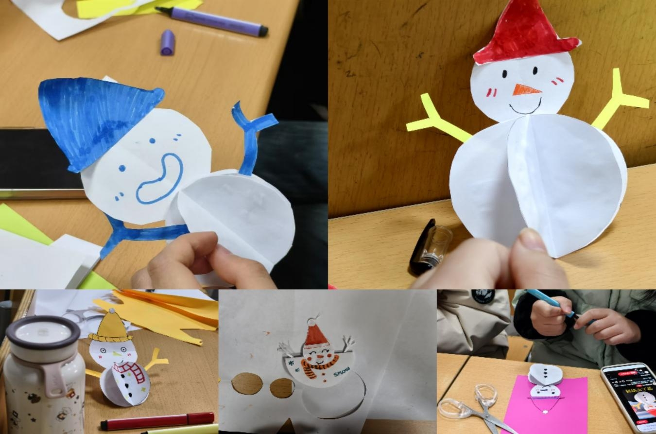 本次手工活动选取的是生活中常见的不倒翁玩具。无论被推倒多少次,不倒翁总是能一次次地站起来,保持平衡和直立的姿态,象征着面对逆境时的不屈不挠的精神。活动开始前,主持人首先向同学们介绍了不倒翁的制作原理和简易的方法以及使用制作工具、材料的注意事项。同学们在拿到制作材料后专注而又热情地投入不倒翁的制作中,小组团队成员协作分工,精心地设计不倒翁的结构,细致的描绘图案,每一步都凝聚着同学们的创意与匠心。同学们的雪人不倒翁作品,五彩缤纷、形象可爱,同学们将自己作品互相进行了交流展示。