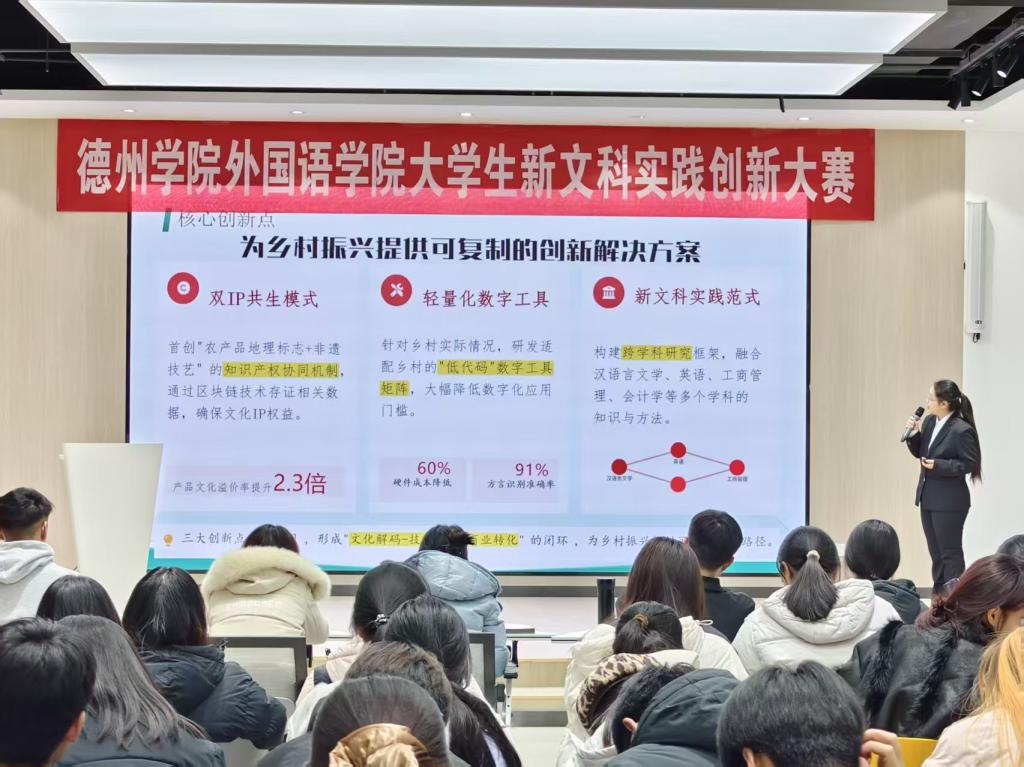 本次大赛以“融创赋能,实践致新 ”为主题,吸引各专业学生踊跃组队参与,经过线上筛选,最终共有6支参赛队伍参与现场赛展示。大赛聚焦社会现实问题,引导参赛学生立足社会现实需求,将外语专业特色与文史研究、教育服务、文化传播、社会治理等领域深度结合,通过实地调研、志愿服务、实习实践、国际交流等形式,用专业知识破解实际问题,最终了形成一批兼具创新性与应用价值的实践成果。比赛过程中,各参赛团队通过PPT汇报、案例展示、现场答辩等形式,全面呈现项目的实践过程、创新亮点与应用成效,充分展现了外语学子“学以致用、以用促学”的专业素养。汇报结束后,评委专家组围绕项目的学科融合深度、实践落地能力、问题解决实效等维度展开专业评审,既肯定了团队扎根实践、务实创新的探索精神,也针对项目优化方向提出建设性意见。