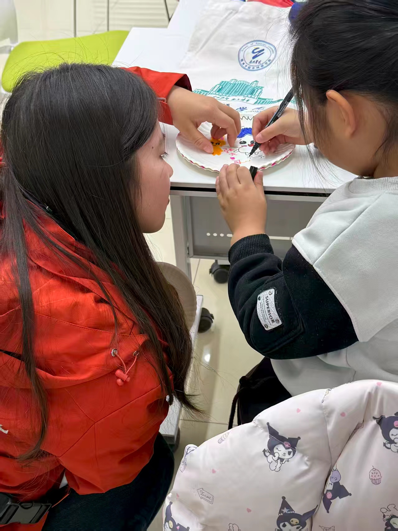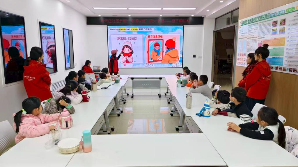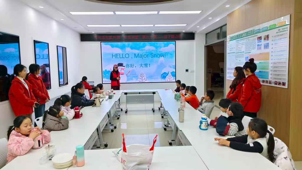 活动中,志愿者先介绍大雪节气的由来,以趣味问答唤起大家对冬日雪景的联想;接着通过双语讲解,带孩子们了解腌肉、补冬等大雪习俗,共读《江雪》等节气古诗并以简单英语解析诗句中的雪景意象;随后进入“画说英语”环节,引导社区儿童手绘雪人、雪景等主题作品,鼓励大家用英语介绍自己的画作;最后小朋友展示作品、分享感受,志愿者为每人赠送自制的大雪主题盘子画。