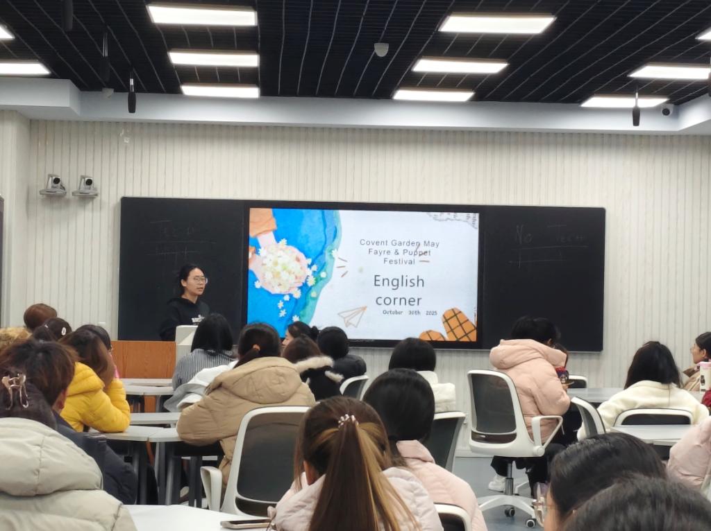 本月最后一期英语角以“考文特花园+五月节庆+木偶艺术”为核心,打造了一场兼具知识性与趣味性的文化盛宴。活动伊始,英文短片带领同学们走进英国考文特花园的五月木偶节,起源介绍、实景图片依次呈现,经典木偶形象、街头表演者、热闹节庆场景等元素扑面而来。随后的“10 秒极速抢答”环节,同学们需快速用英文说出图片中的事物,从“Punch and Judy puppets”(潘趣与朱迪木偶)到“open-air stage”(露天舞台),大家争相举手、反应迅速,在欢乐的比拼中巩固了节庆相关英文词汇,更直观感受到了异国节庆的独特魅力,让英语学习与文化探索深度融合。