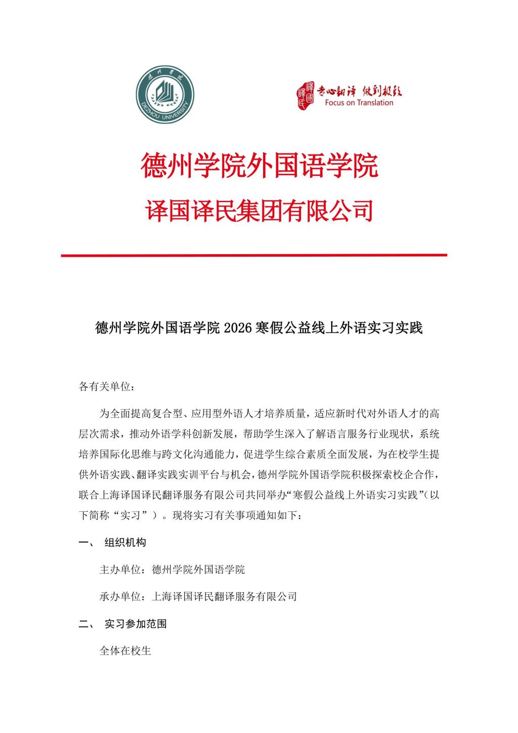 德州学院bbin游戏官网的官方 2026 寒假公益线上外语实习实践