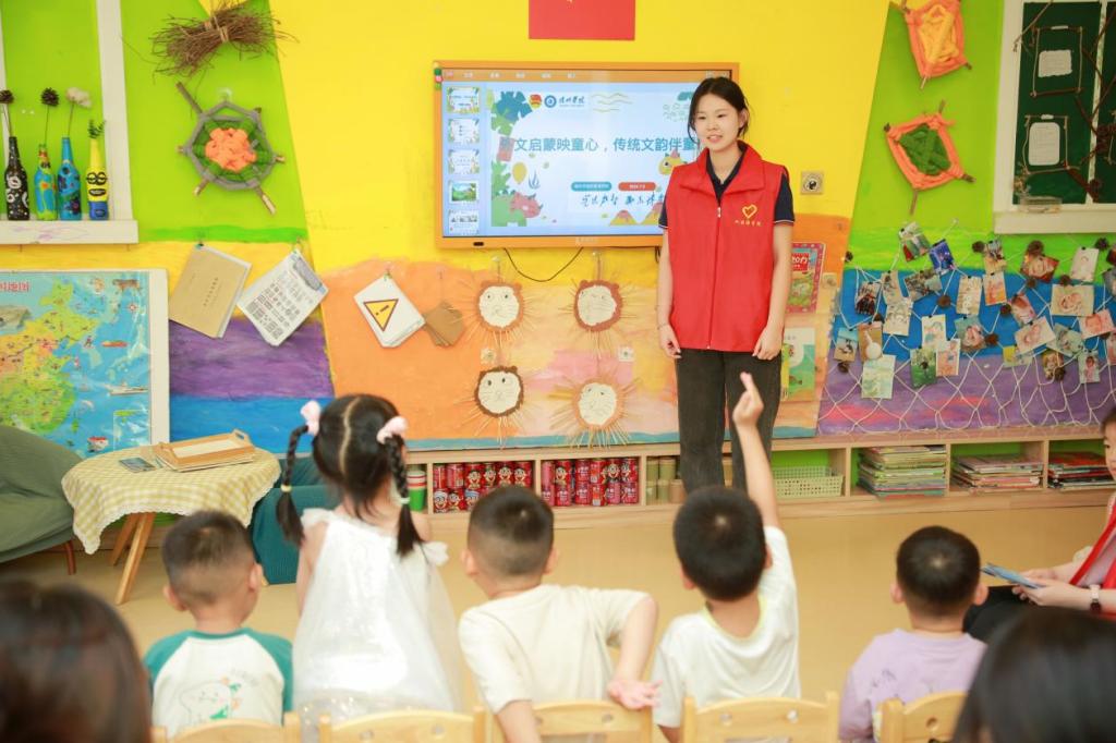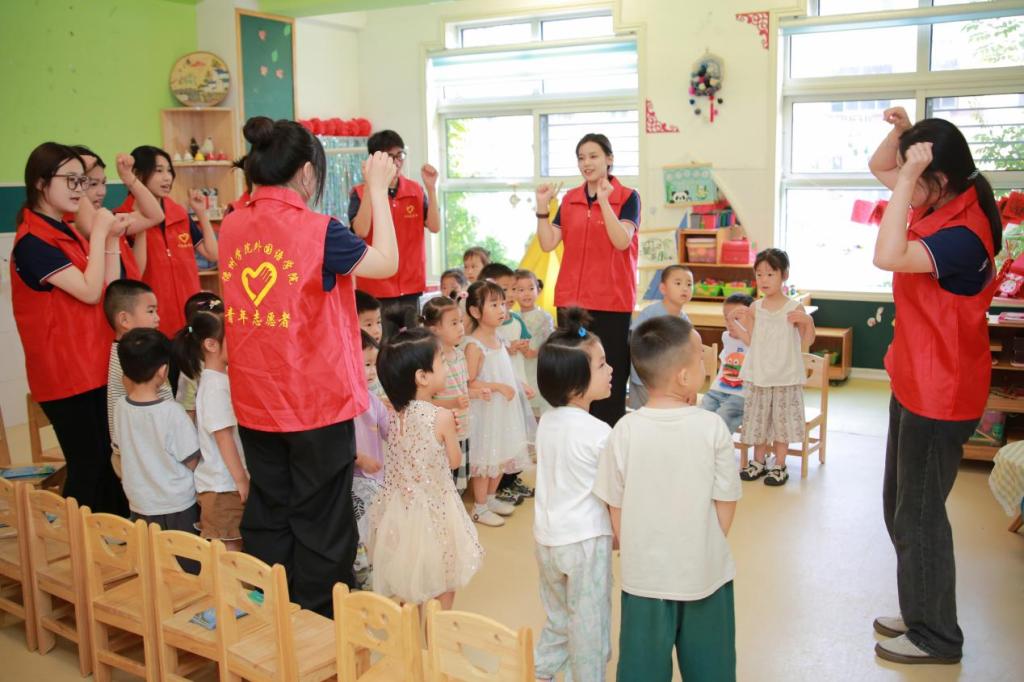 大手拉小手,共述中国故事。在禹城市金辰公馆幼儿园,队员们结合博物馆所学所思及自己的专业知识,深入浅出向小朋友们讲解好公而忘私、民族至上、民为邦本、科学创新等为内涵的大禹治水精神。同时采用英文歌曲、互动游戏等多种形式,给小朋友们普及了一些基本的防溺水知识,为小朋友们度过一个平安、快乐的暑期生活提供知识储备。