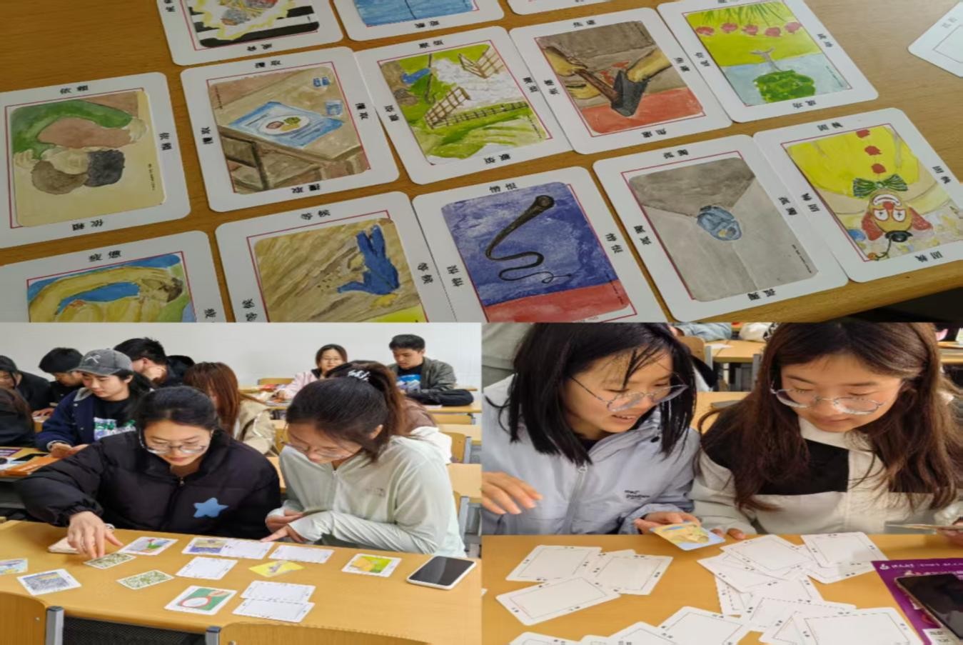主持人首先向同学们介绍了OH卡牌的玩法规则:卡牌分为图卡和文字卡,参与者随机抽取组合后,通过联想构建故事,进而解读潜意识中的心理状态。同学们依次抽取3-5张图像卡,在组内分享图片描述与直觉感受后,将其与文字卡自由组合,探索图像与文字的潜在关联。“破碎的镜子”图像卡被放置在“重建”文字卡旁时,引发关于自我接纳的深入探讨;“星空”图像卡与“无限可能”文字的组合,则让参与者重新审视内心潜能。