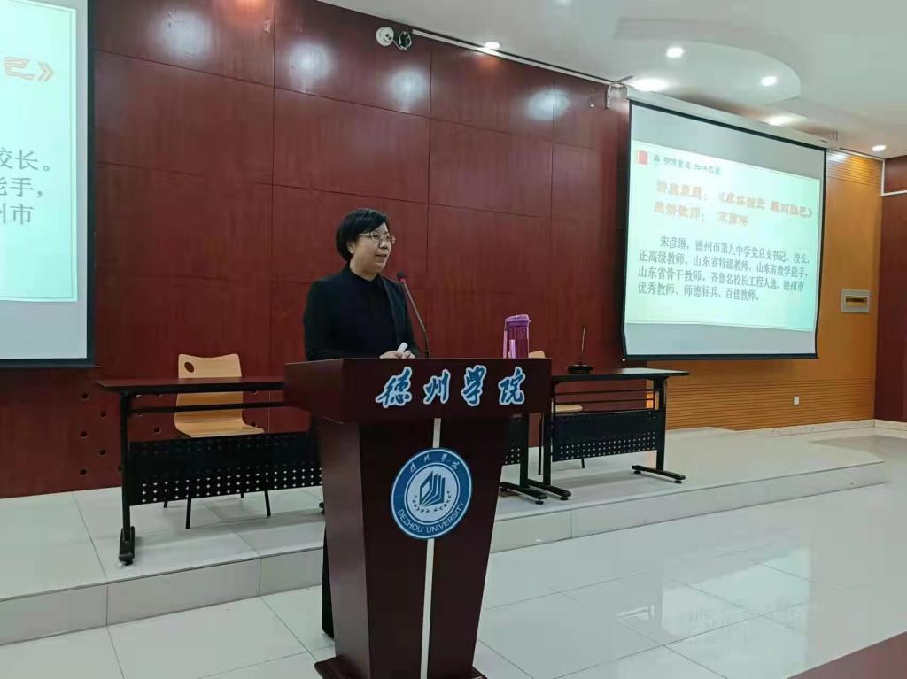 为切实提升师范生综合职业素养,2021年12月3日,bbin游戏官网的官方邀请齐鲁名校长、德州市第九中学教育集团党总支书记、校长宋彦琳女士来校作题为“卓然独立,越而胜己 —基于学校视角的教师发展”的专题讲座。bbin游戏官网的官方主要负责人、院长助理、英语系部分教师及2019级本科和2021级专升本全体英语师范生参加了此次讲座。