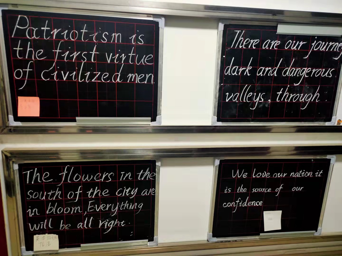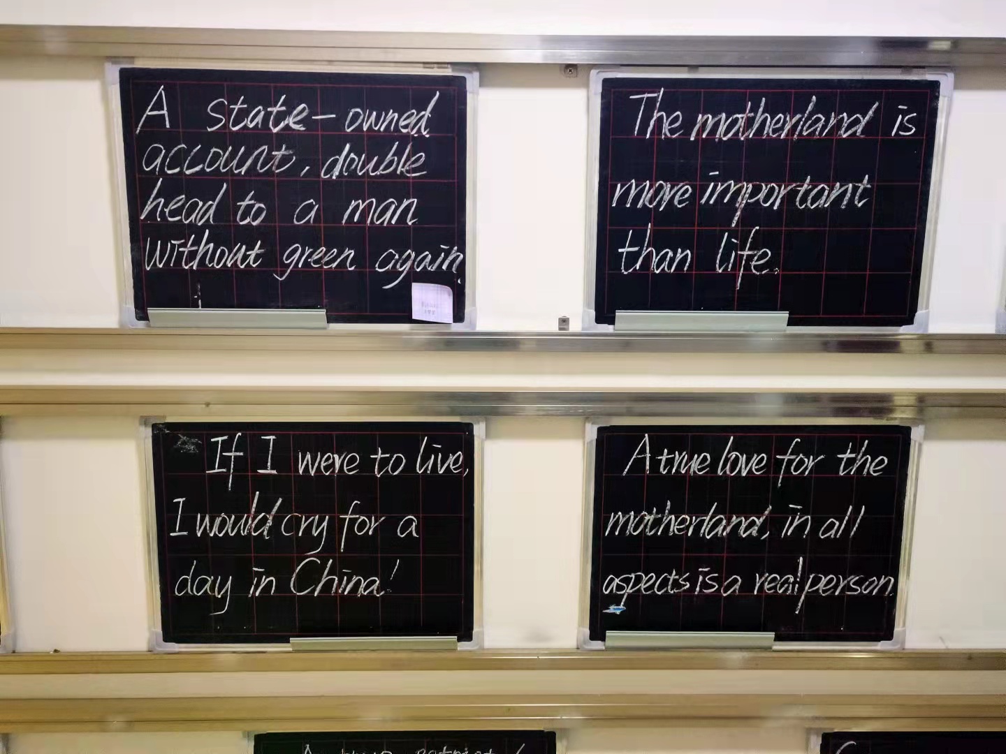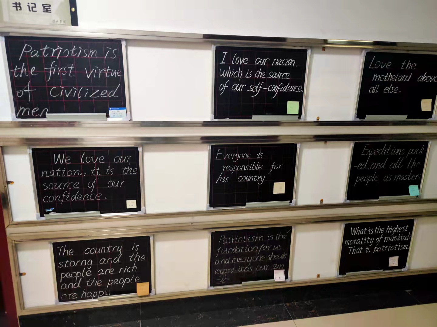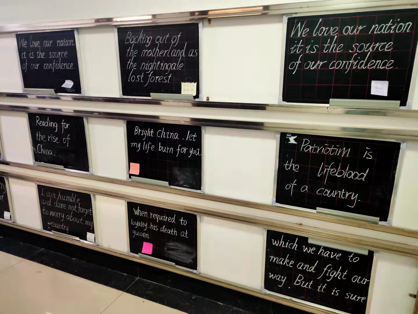本次活动中,同学们用外国语,通过粉笔字,在小黑板上书写一句句对祖国的祝福、一首首对祖国的告白情诗、一段段触动心灵的爱国字句,写出大家内心深处对祖国深情的告白。同学们的作品在博文楼展出,一排排的小黑板,道出了外院学子对党、对祖国的真挚情感和美好祝福。书法展吸引了广大师生前来参观,大家对书法作品表现出浓厚的兴趣,纷纷表示要更进一步学习书法,弘扬中华民族优秀传统文化。本次书法展不仅是对我院学生书写水平的一次检阅,而且引导学生厚植爱国主义情怀,提高爱国意识,对弘扬传统文化、坚定文化自信起到积极的推动作用。